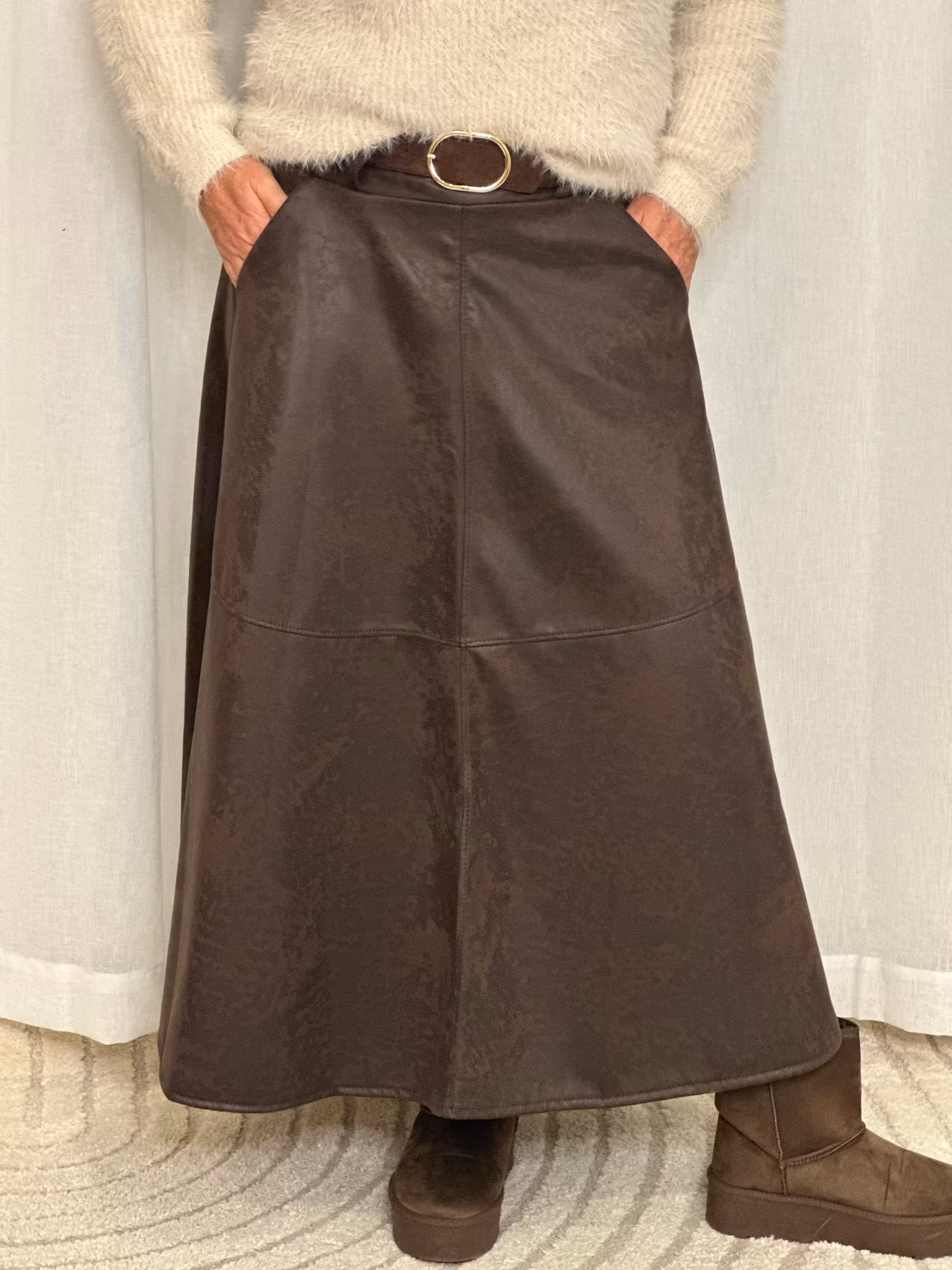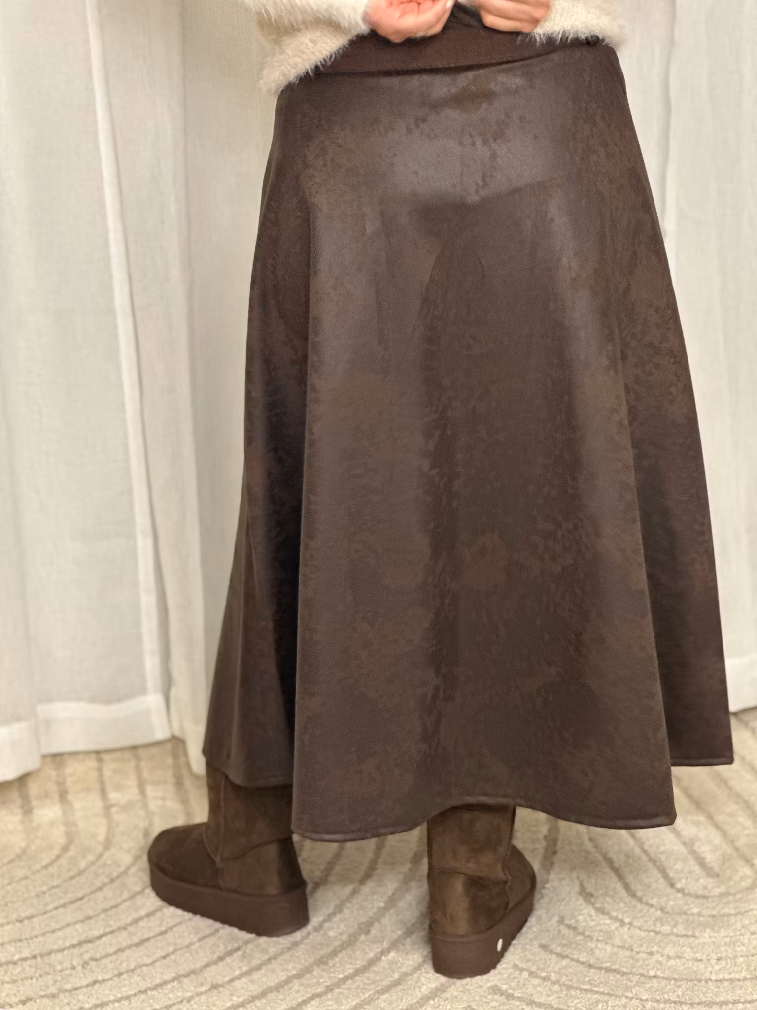 Produktbeskrivning:Katja är en elegant A-linjekjol i mjukt fuskläder med en sammetslen yta. Den höga midjan och den stilfulla vidden skapar en smickrande siluett – lätt att styla för vardagsbruk eller klä upp för festliga tillfällen.