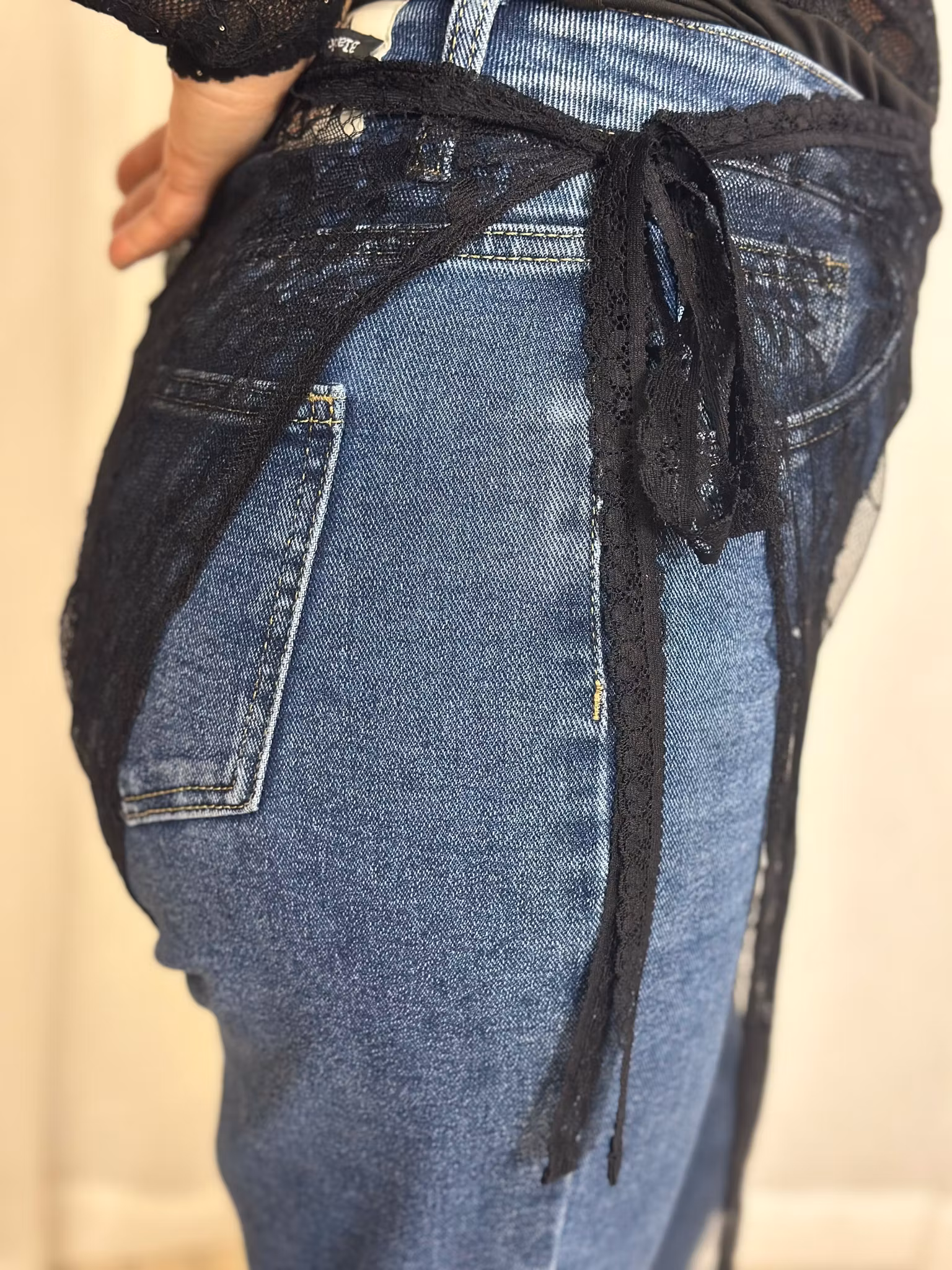 spets förkläde att knyta utanpå byxa eller kjol