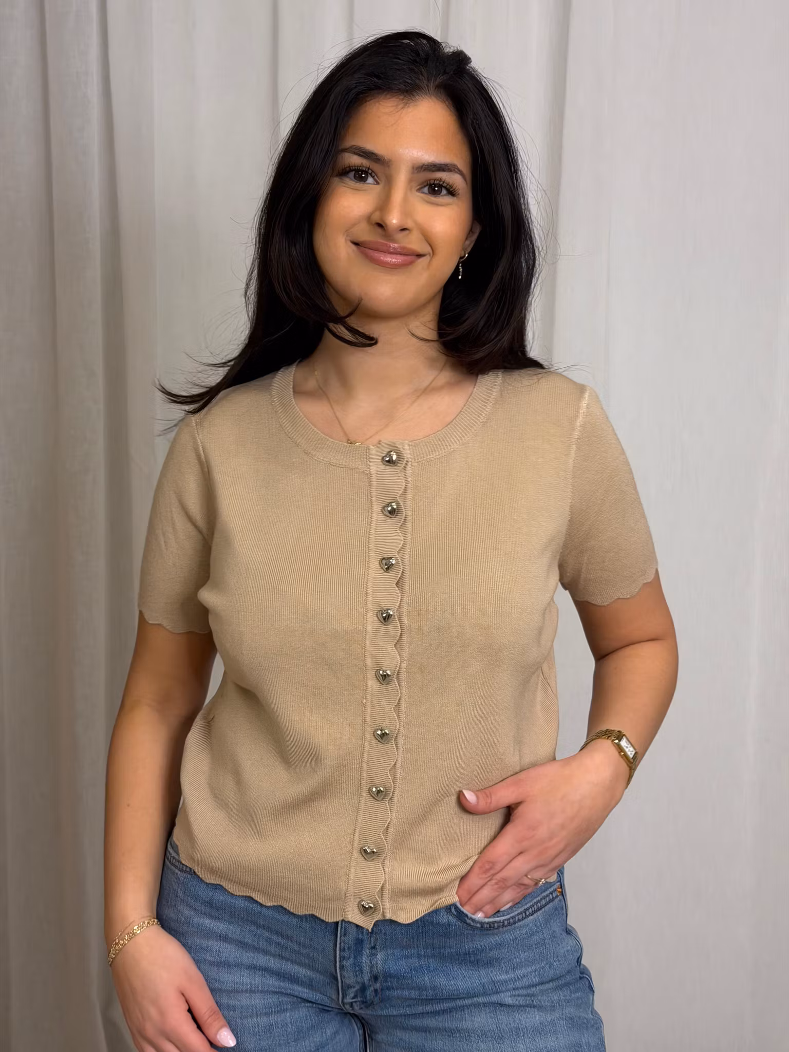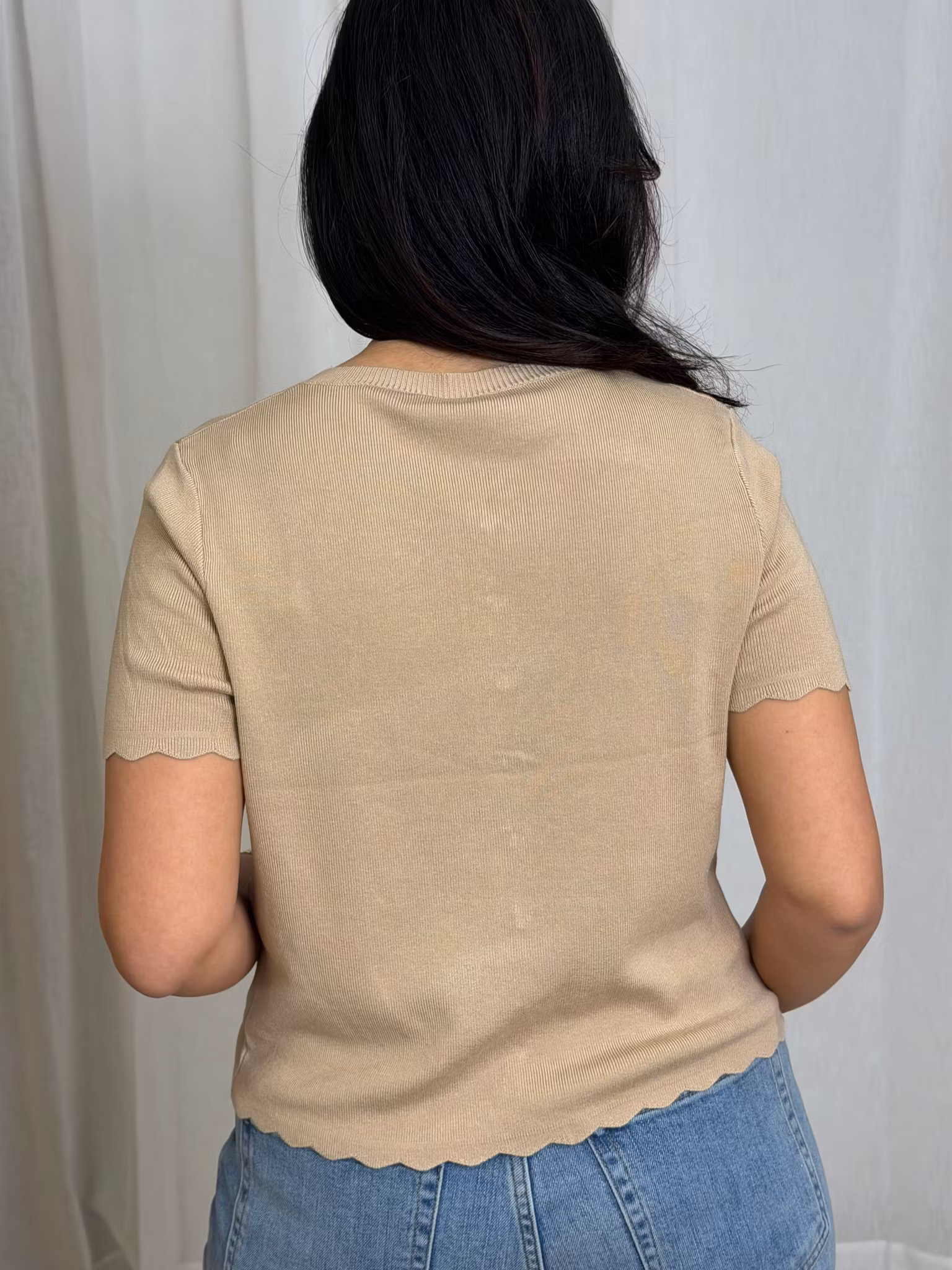 Kortärmad samt fin vågad kant vid ärmslut,vi knapparna och längst ned på toppen.