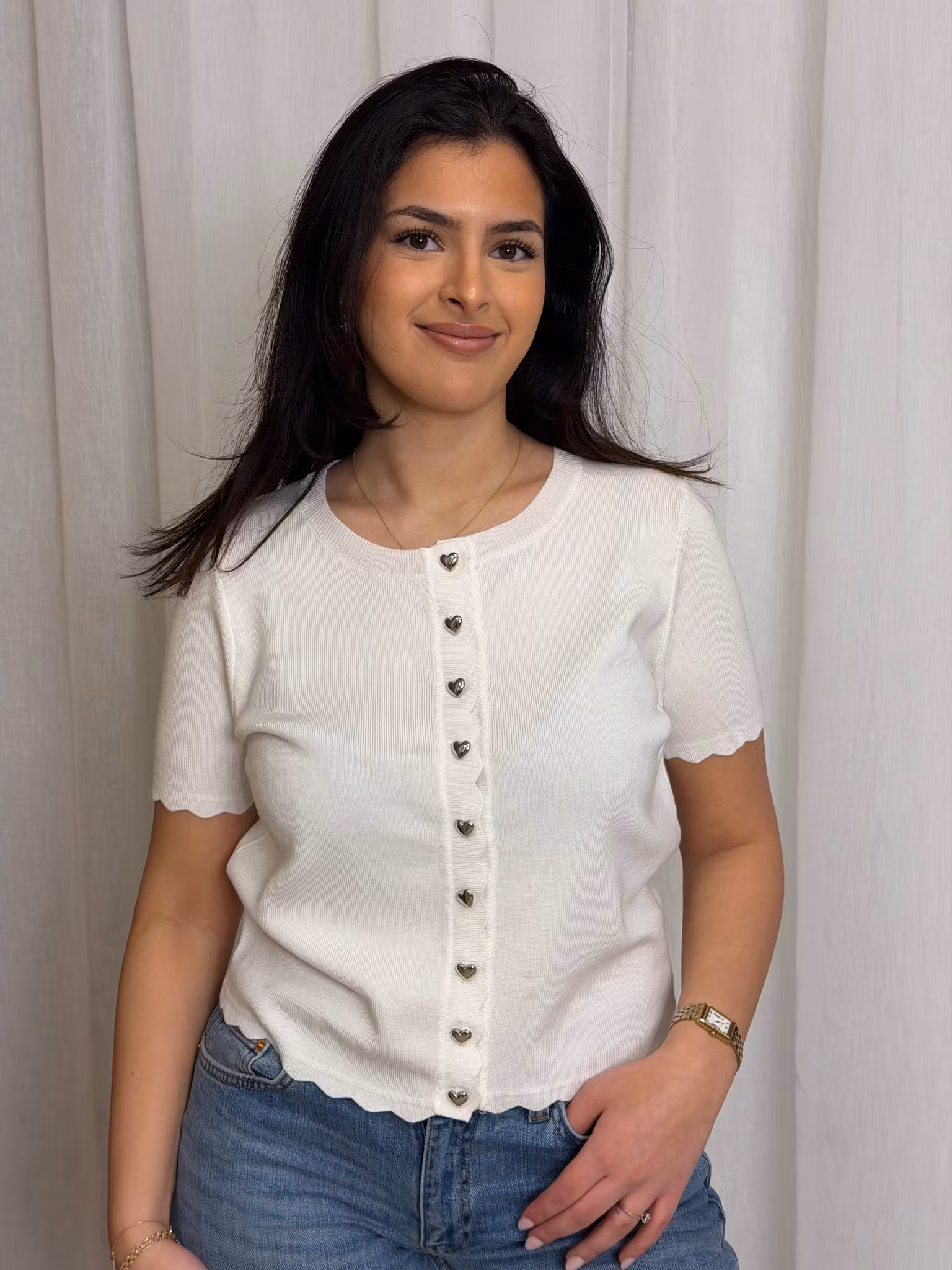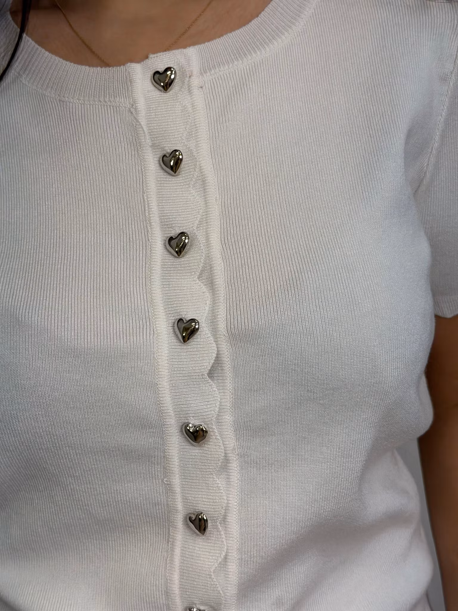 Kortärmad samt fin vågad kant vid ärmslut,vi knapparna och längst ned på toppen.