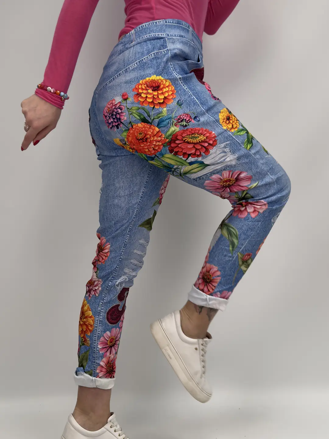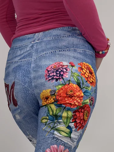 Ayna är stretchbyxor som verkligen drar blickarna till sig. Det printade mönstret med stora blommor ger en livfull och självsäker känsla, medan den följsamma stretchen sitter bekvämt hela dagen. Med fickor både fram och bak får du en perfekt mix av stil och funktion – för dagar när du vill känna dig både bekväm och fantastisk.