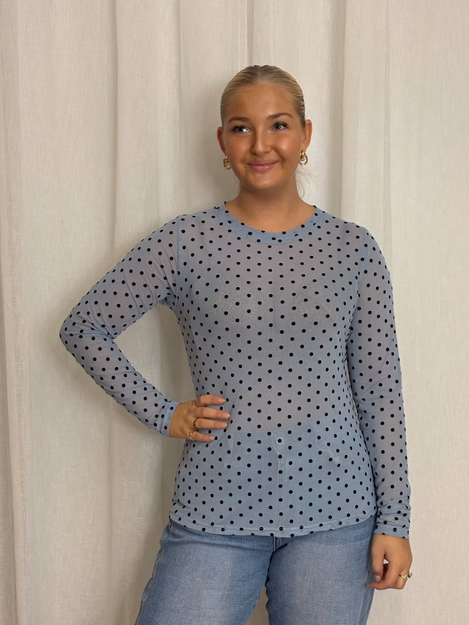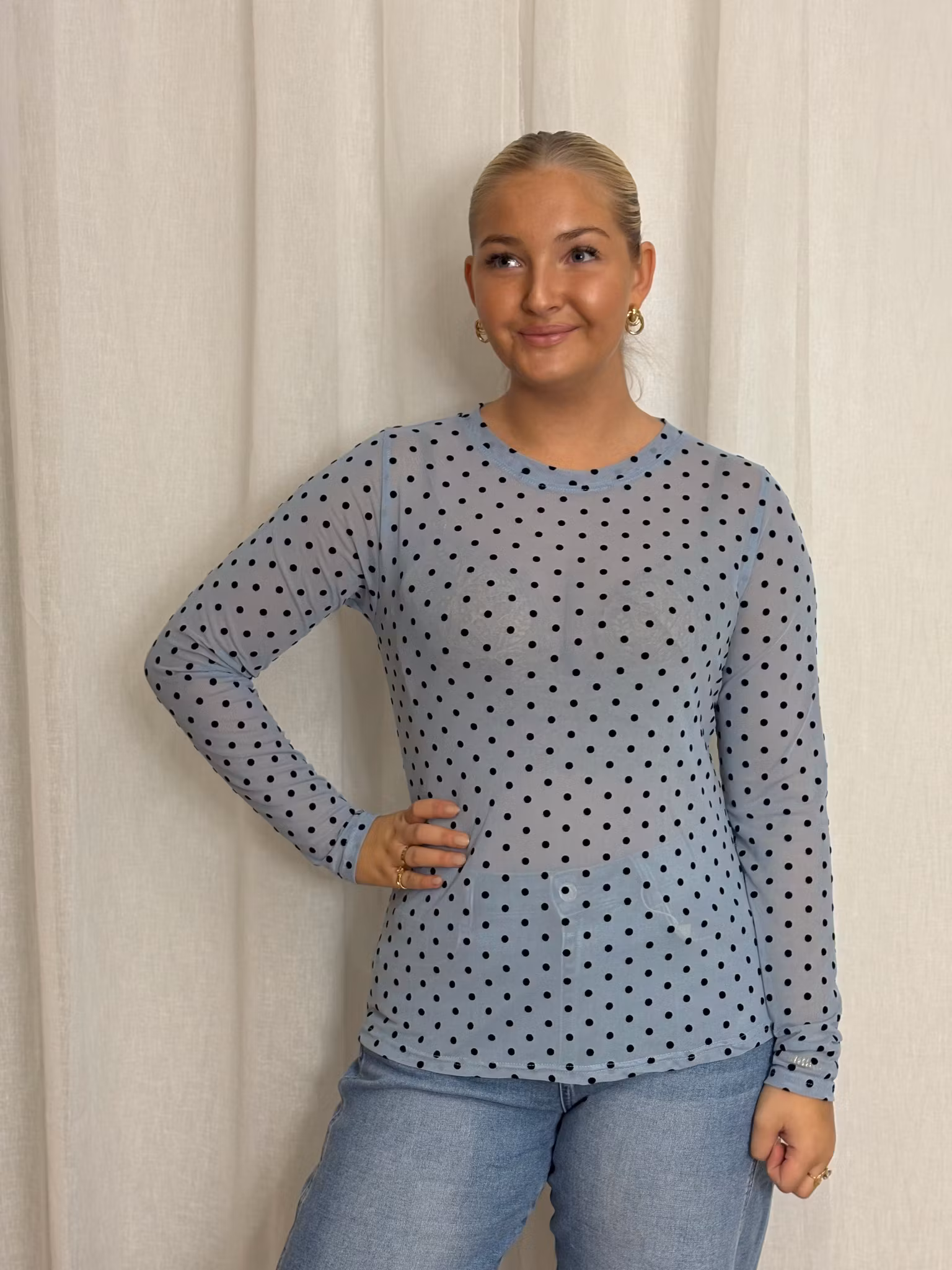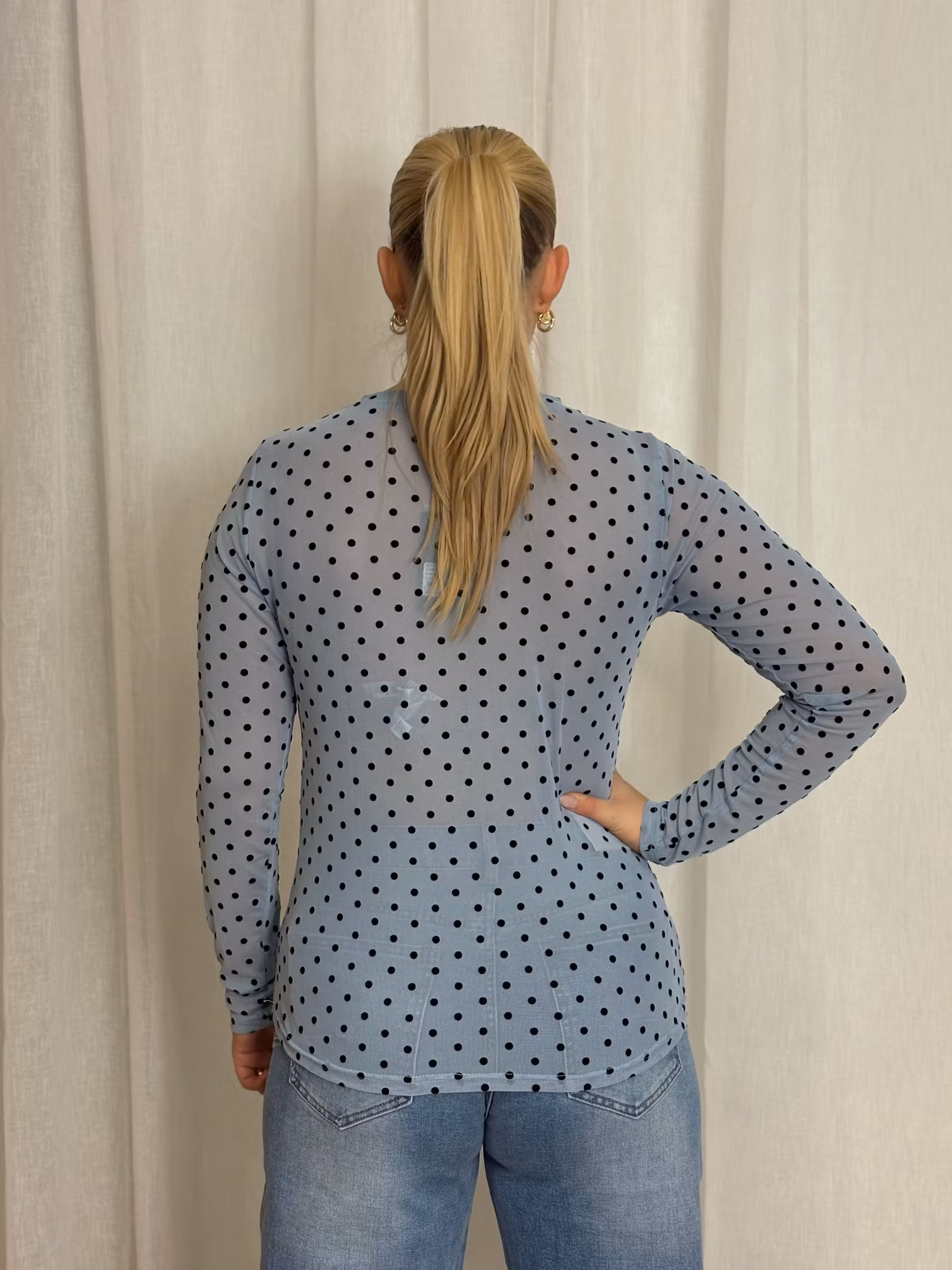 Mesh tyg i duvblå med svarta prickar