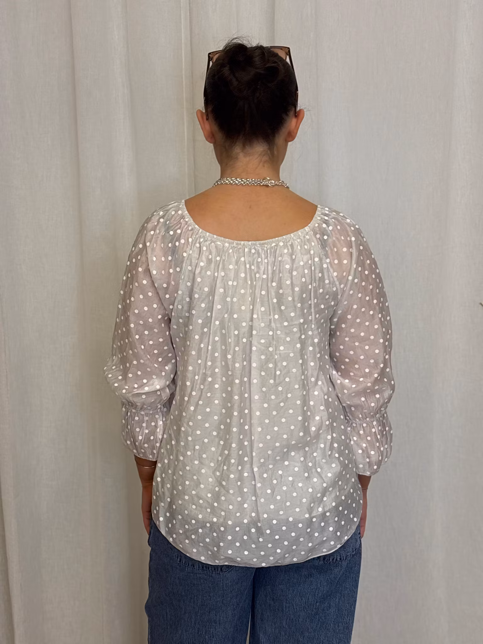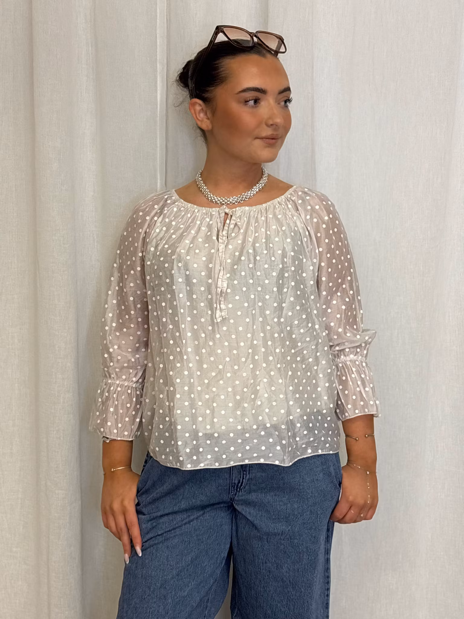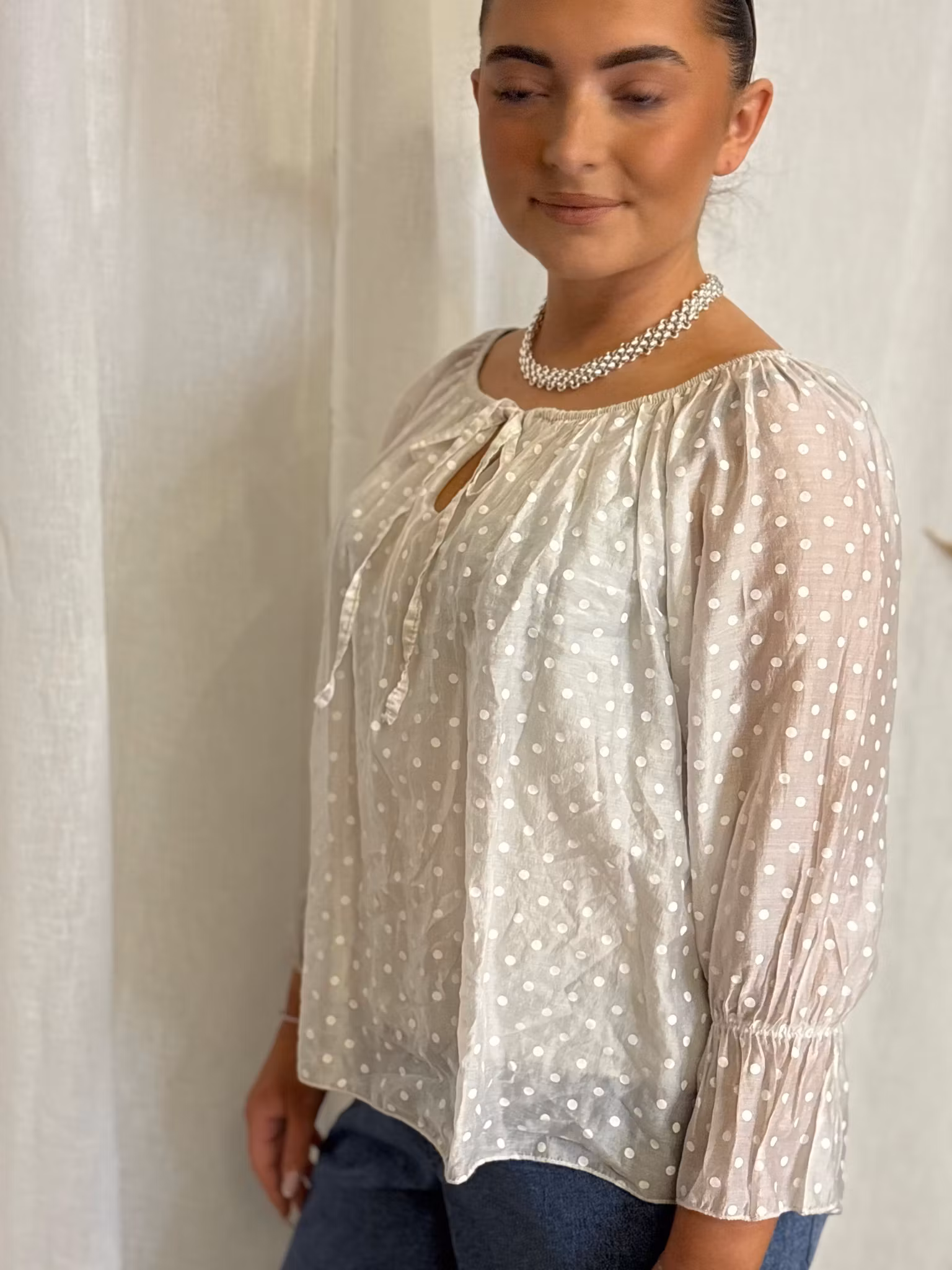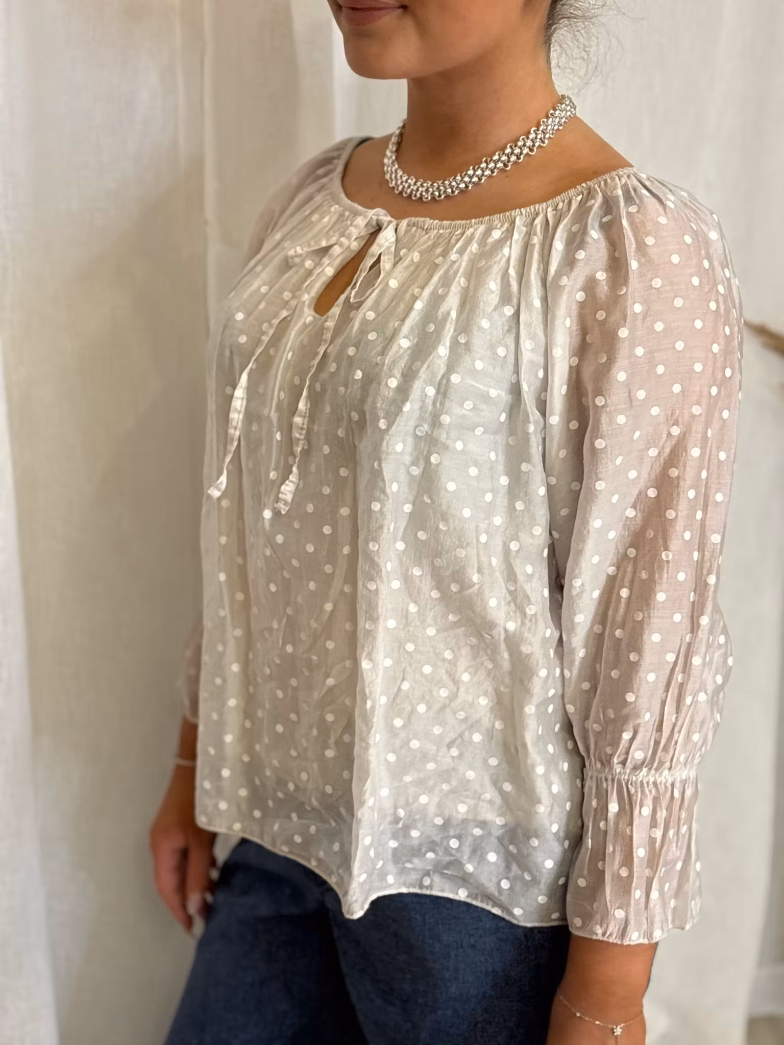 Kommer i beige med vita prickar samt vit med marinblå prickar