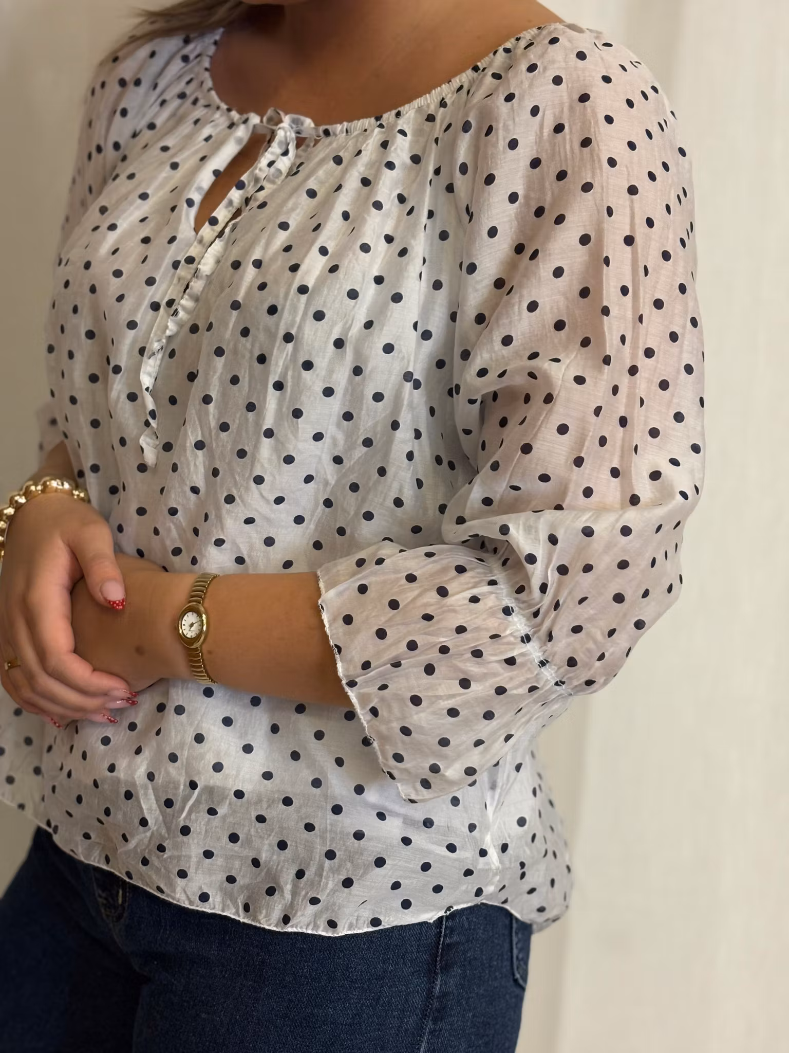 Kommer i beige med vita prickar samt vit med marinblå prickar