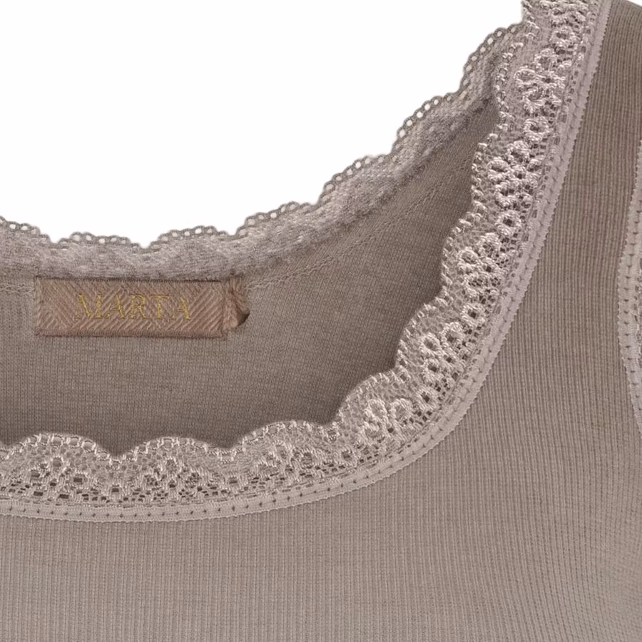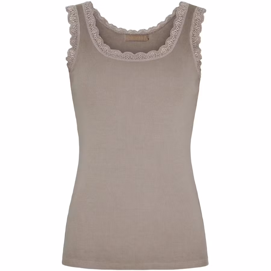 Feminin tanktop med fina spetsdetaljer längs halsringningen och ärmöppningarna. Fungerar som basplagg eller att styla ensam på varma dagar.