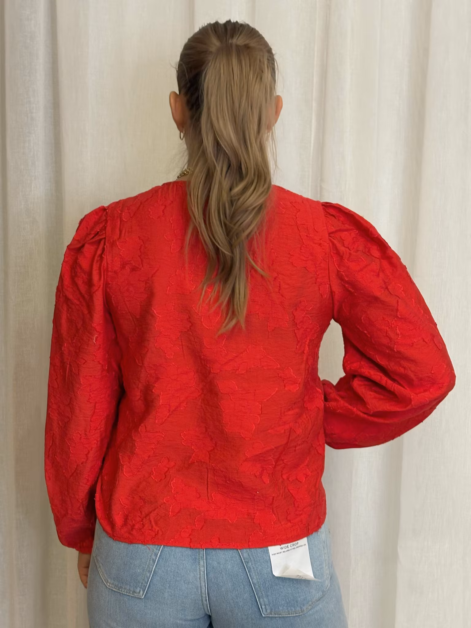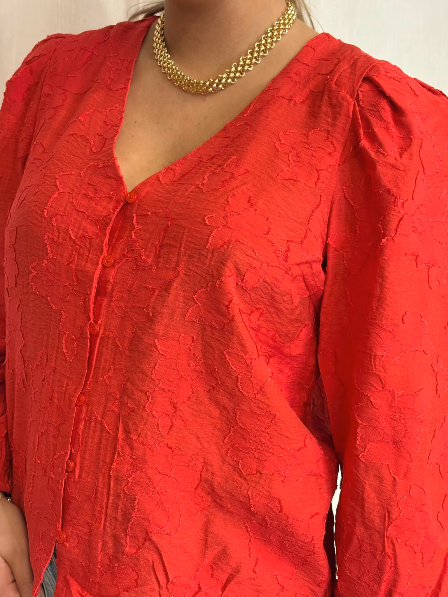 Röd blus med klädda knappar