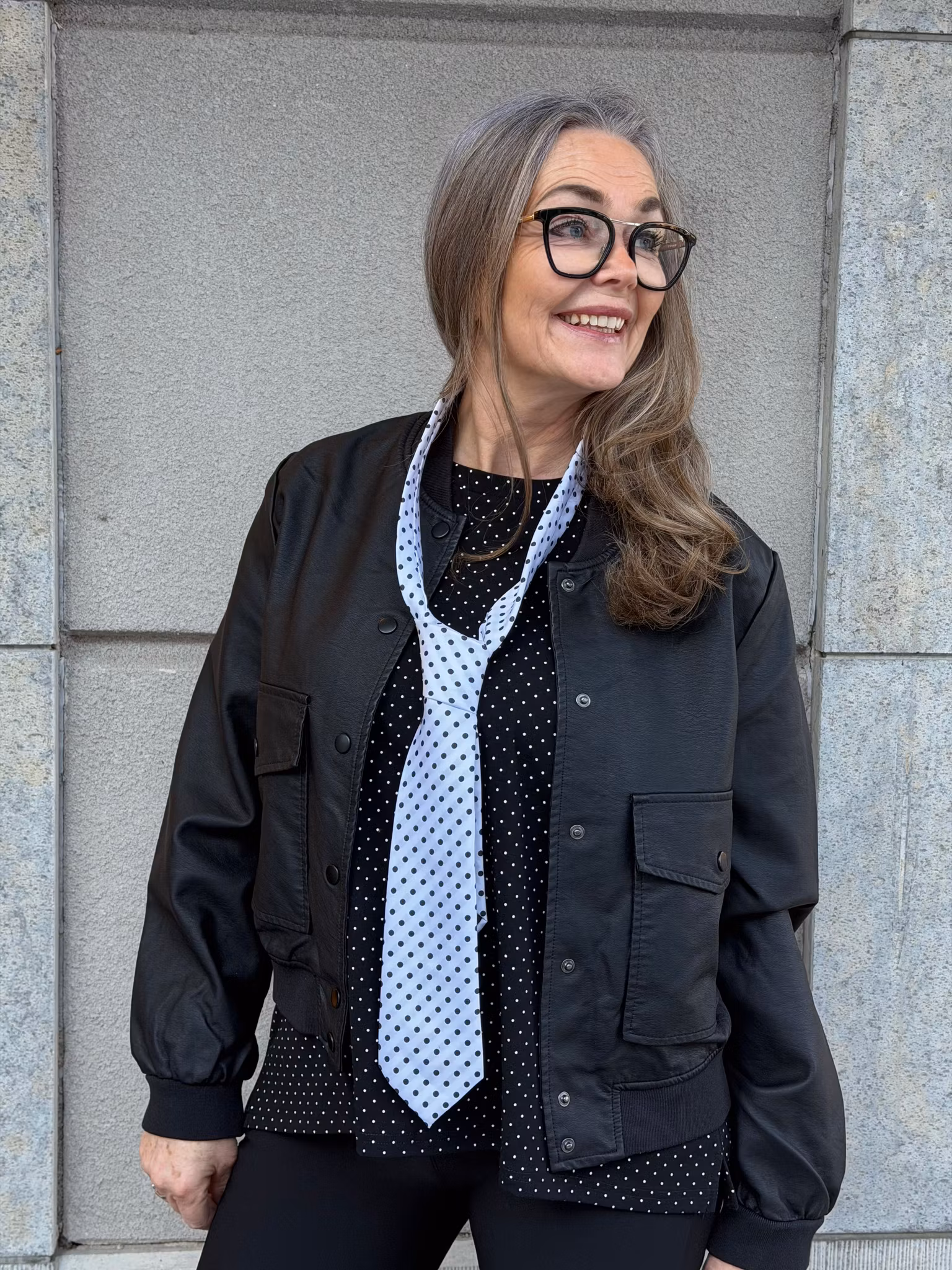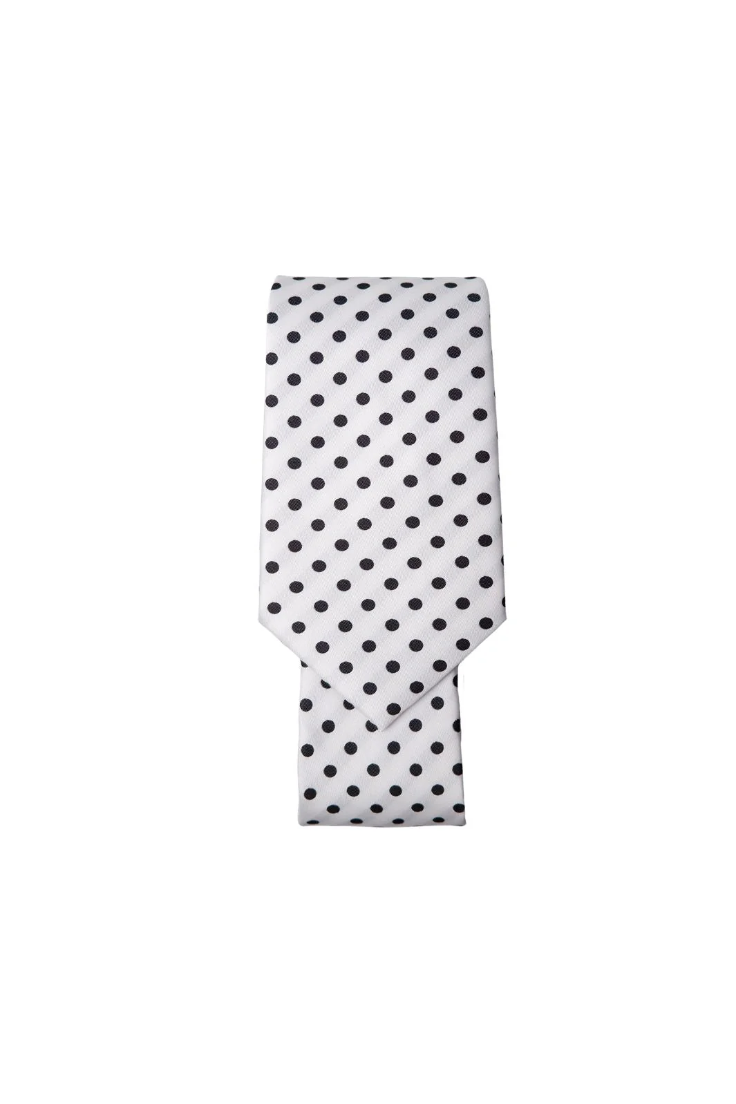 Slips med vit botten och svarta prickar. Slipsen har en klassisk form med spetsig ände.