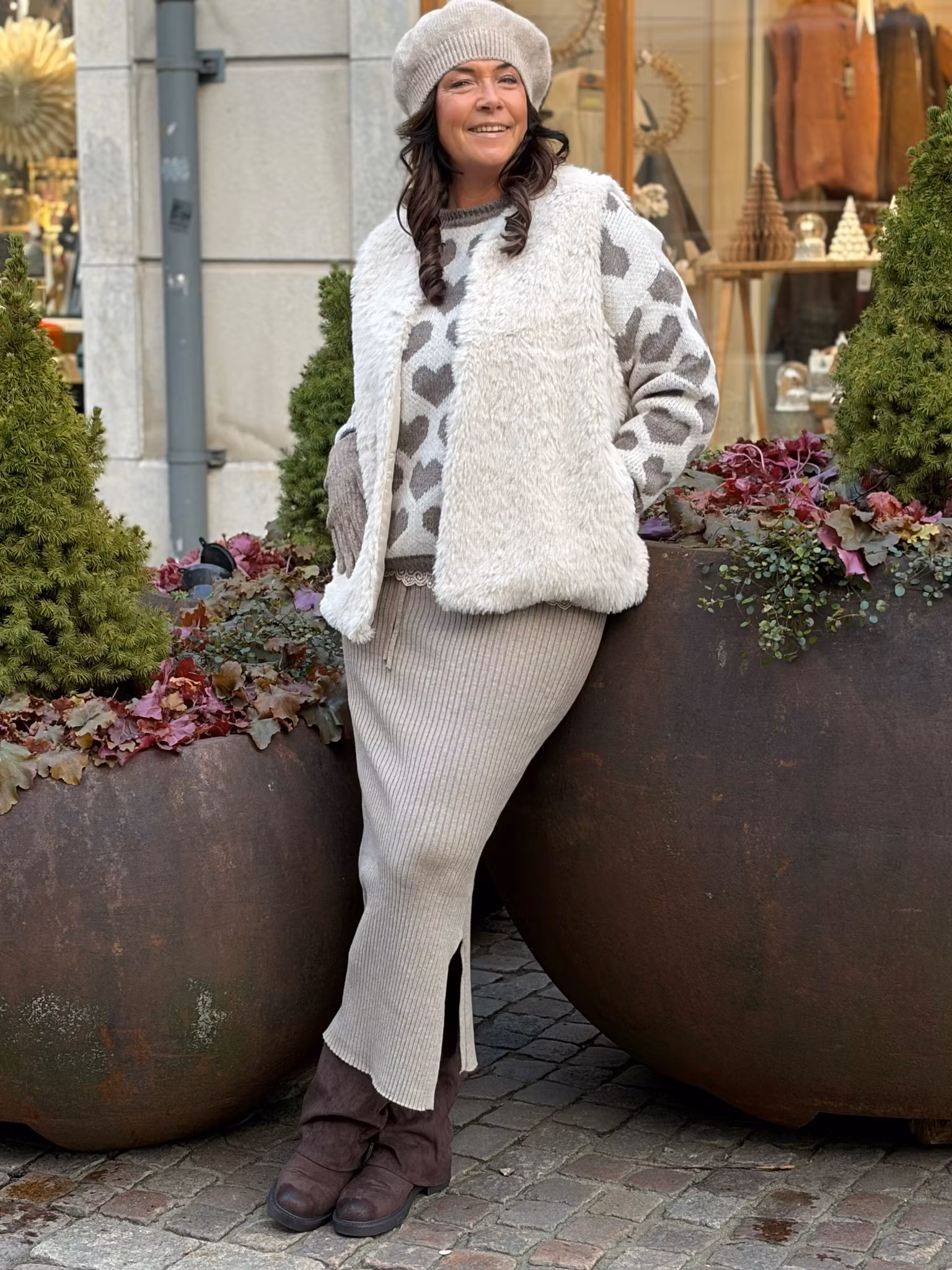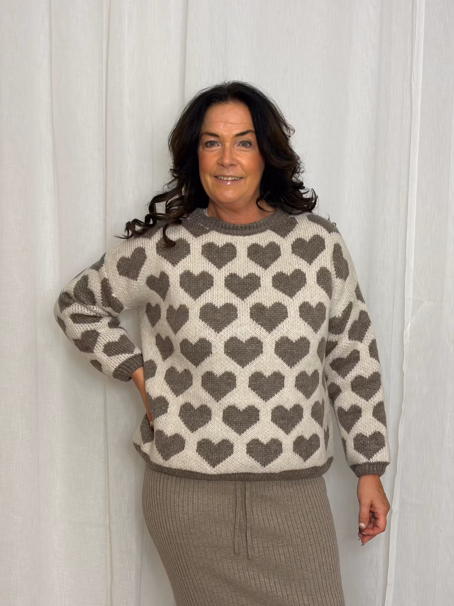Stickad tröja med hjärtan i fango /cremevitt