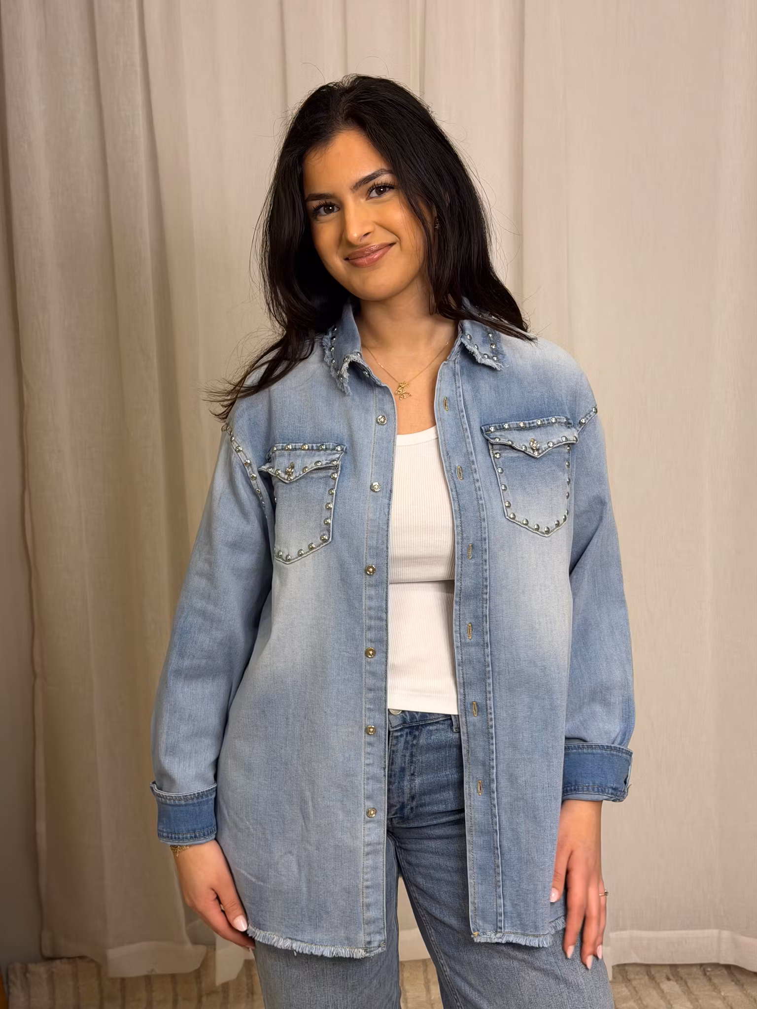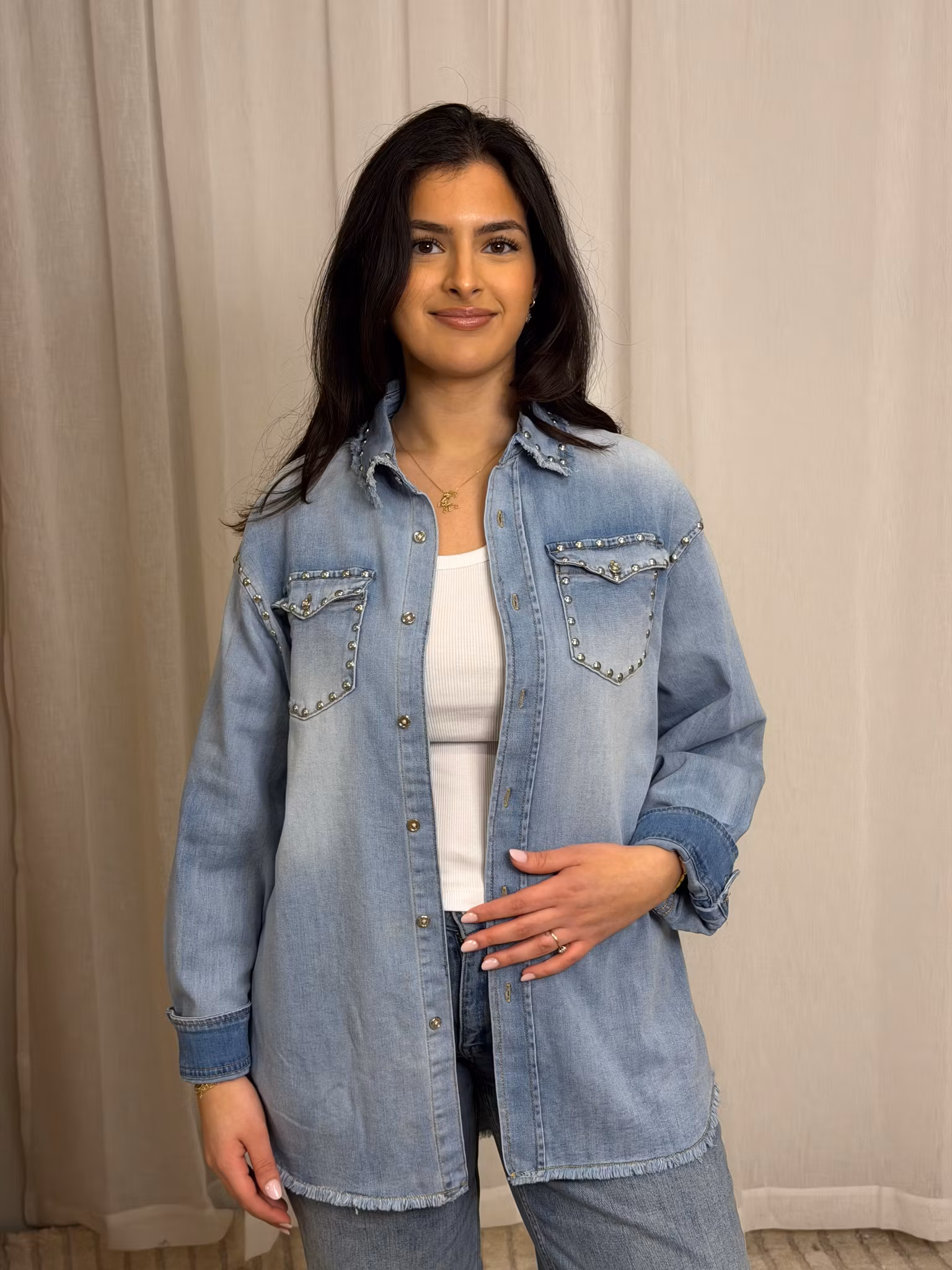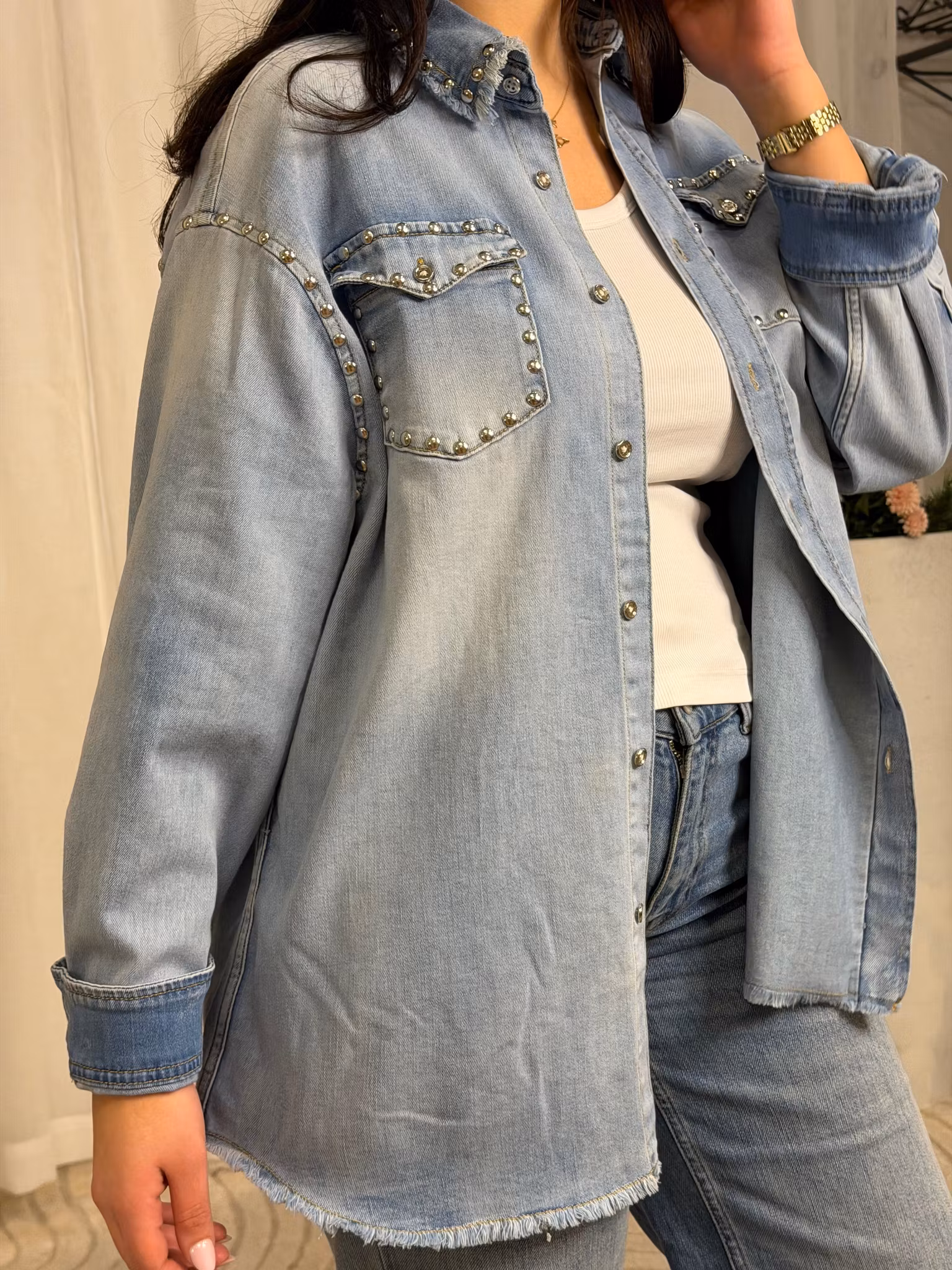 New arrival, denim shirt, soft fabric, with collar, pockets, buttons, studded design, punk style, trendy and versatile.