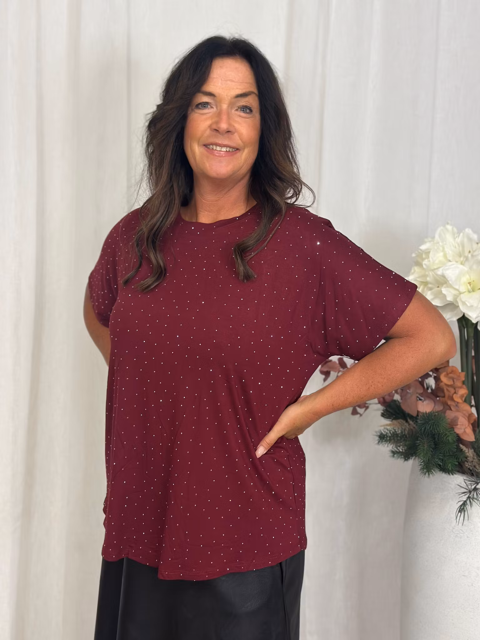 top i trikå med strass stenar. normal till något rymlig i modellen. 95% viskos 5% elastan