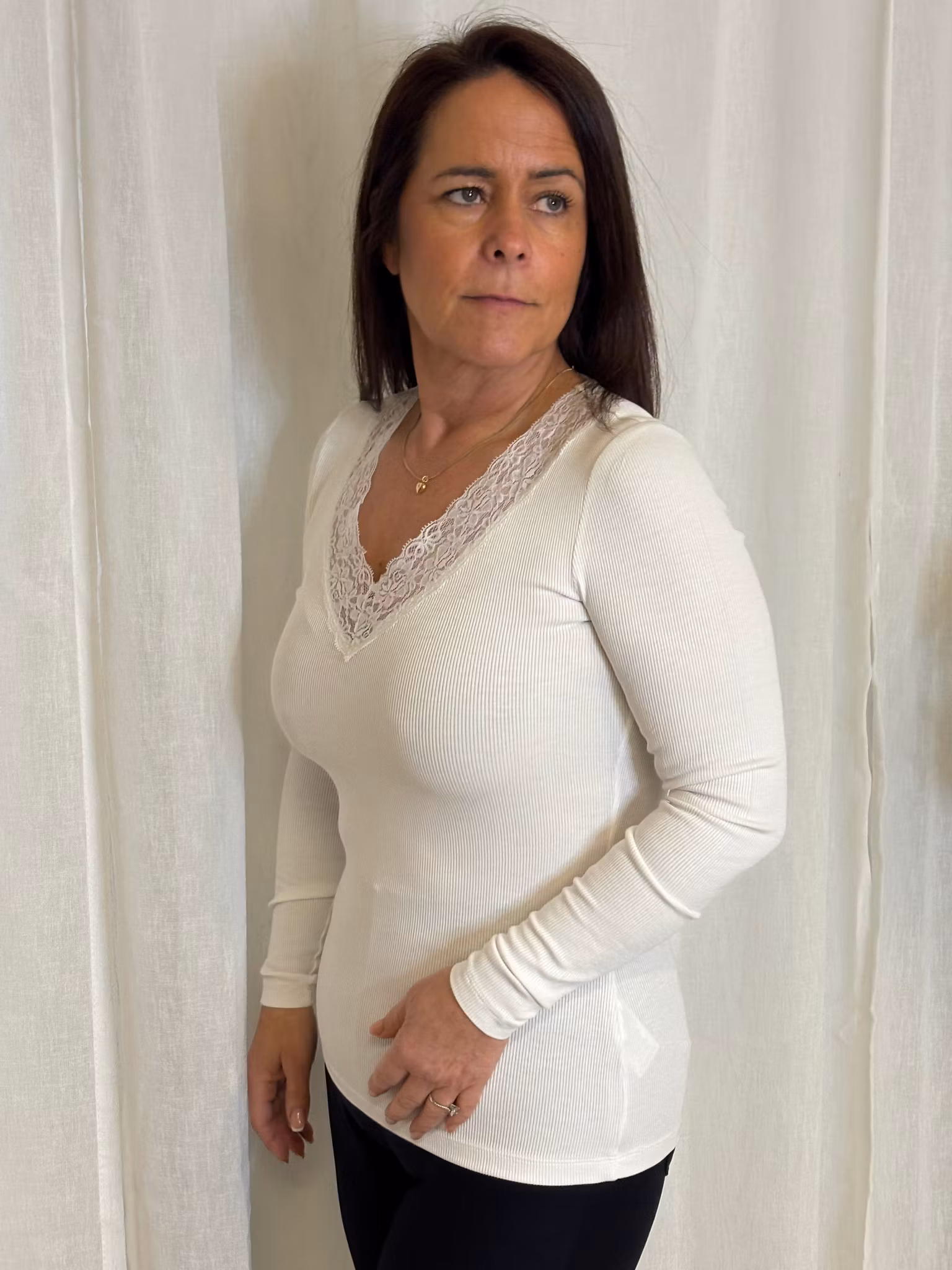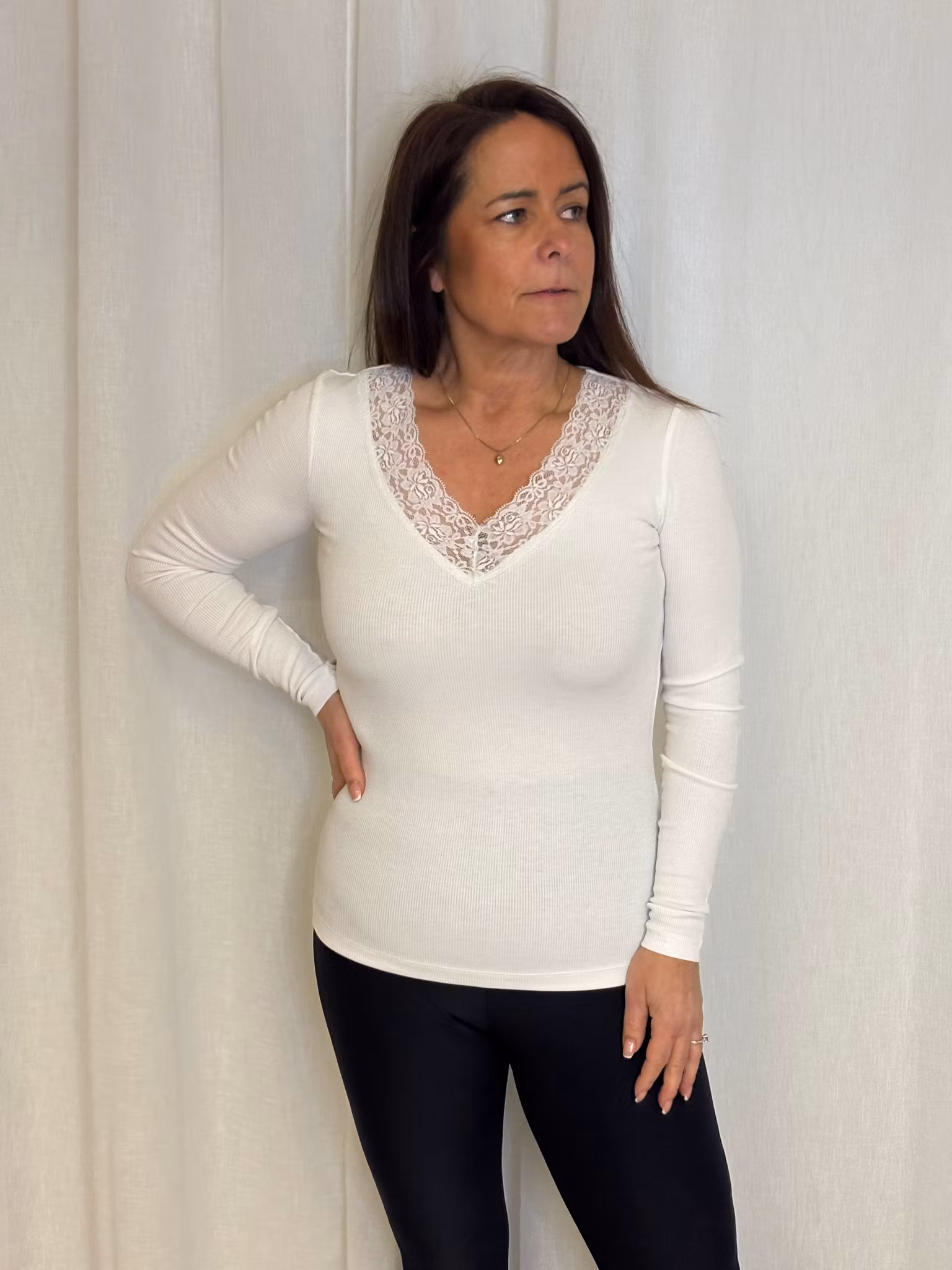 Ribbad top med spets i halskant. 95% viscose 5% elastan