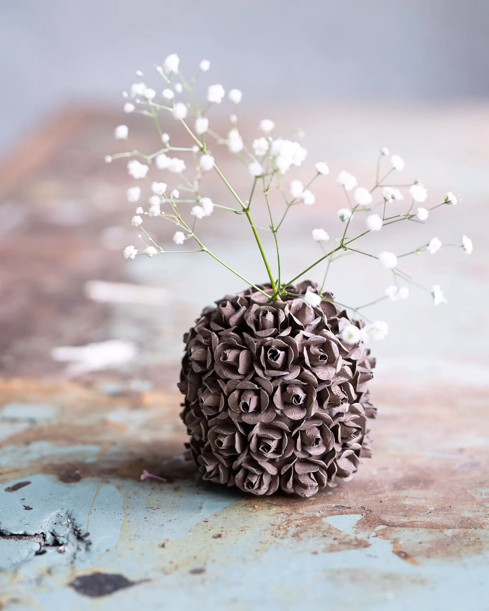 Denna vas med dekorativa rosdetaljer är vacker både som den är och tillsammans med blommor. Tillverkad i metall