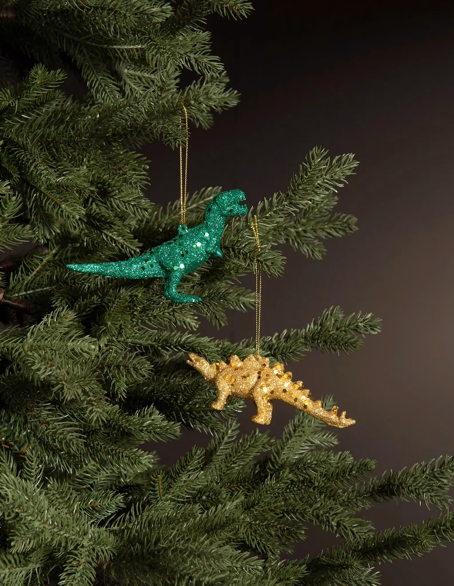 Klä julgranen eller dekorera blomsterarrangemanget med ett set med glittriga hängande dekorationer som ser ut som dinosaurier. Tillverkade av plast.