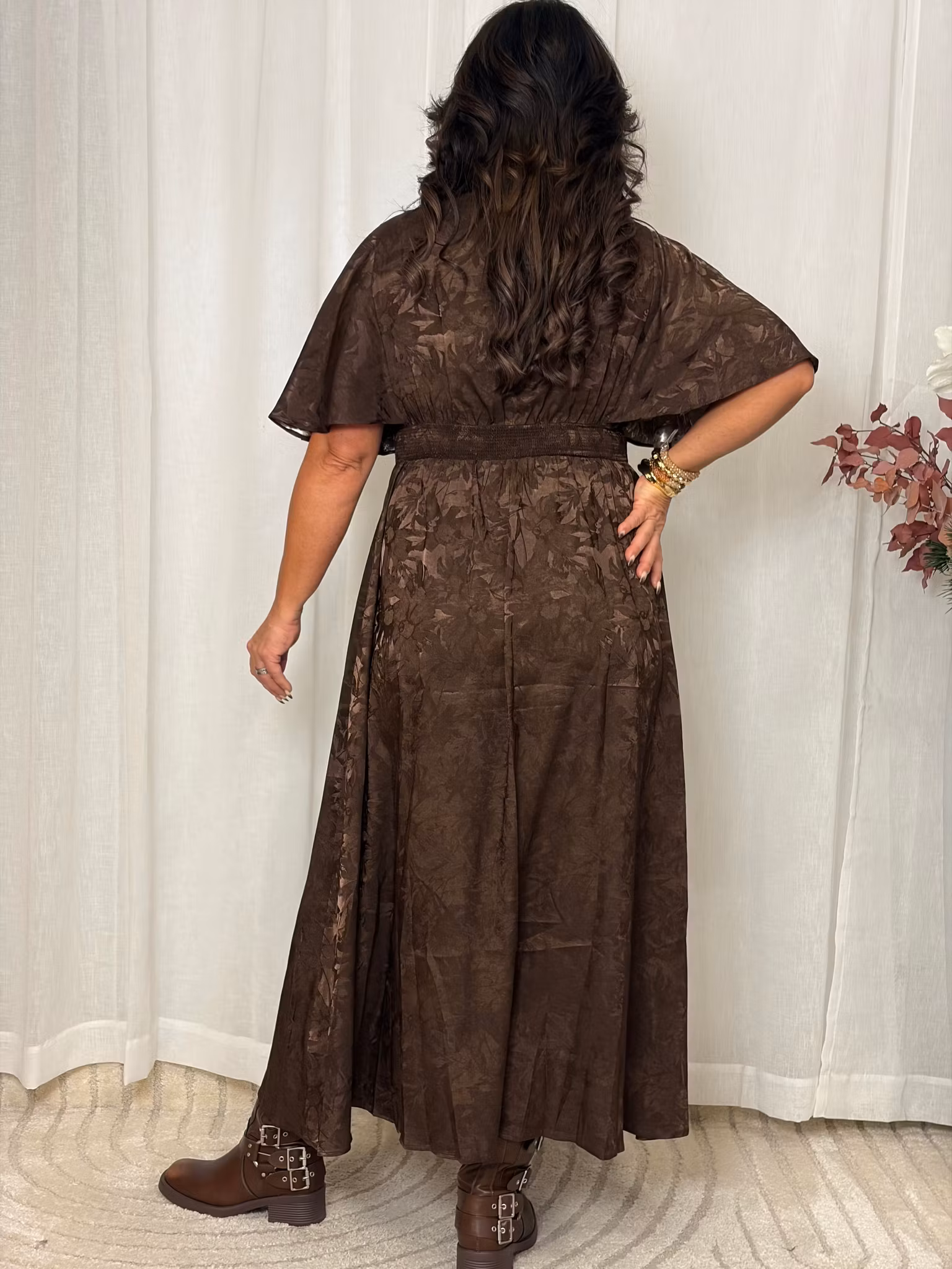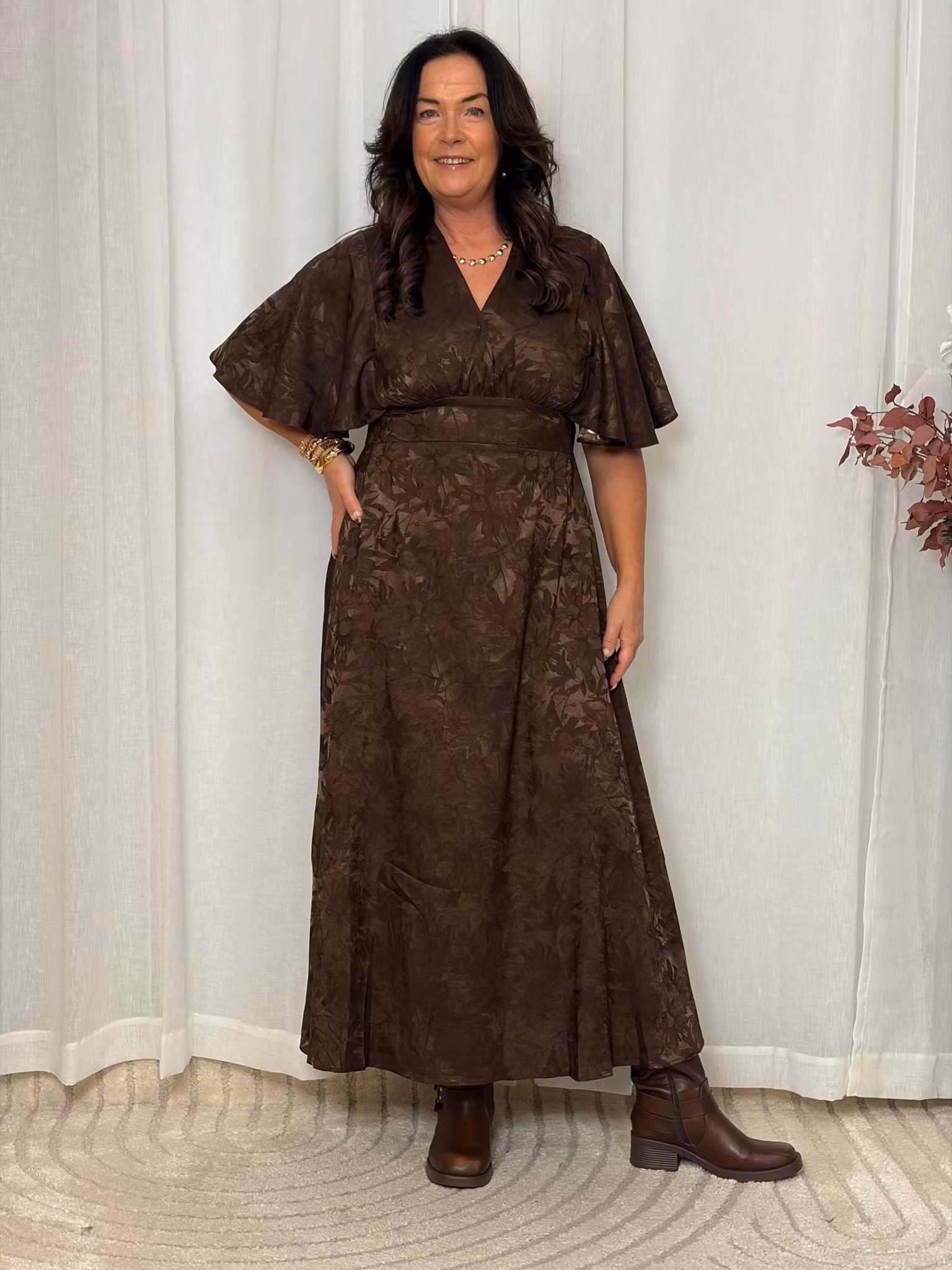 Fin klänning i chokladbrunt med blommönster i tyget och lite skimmerV-ringad framtill och har en bred linning framtill under bysten och smock bak i ryggen som gör att den sitter braKort ärm som är lite fjärilsärmLängd från axel och ner är: 136 cmNormal i storlekMaterial: 100% polyesterTvättråd: 30 grader