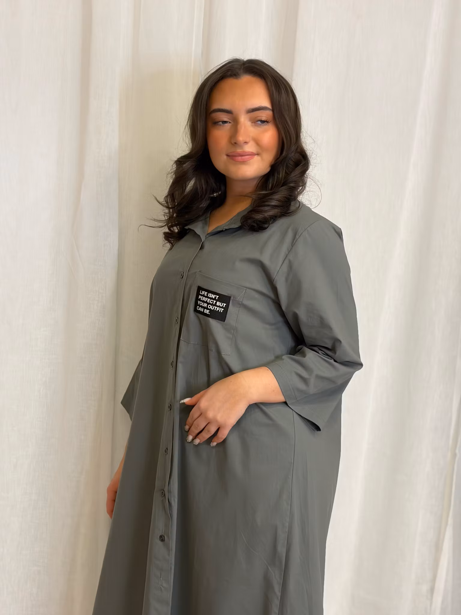 Tuff helknäppt bomullsklänning med ficka fram och med ett litet märke på fickan.