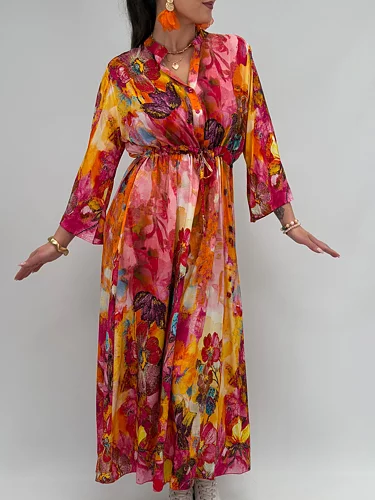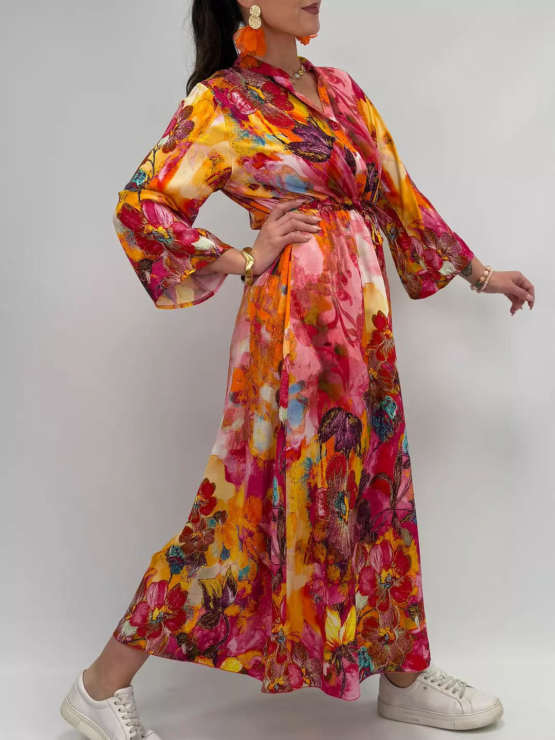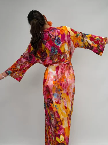 Kicki är maxiklänningen som känns som en färgsprakande midsommarnatt i rörelse. Det blommiga printet drar blickarna till sig direkt och snörningen i midjan låter dig forma silhuetten precis som du vill – markerad och feminin eller mjuk och svepande. De vida ärmarna ger ett härligt fall och extra liv i varje steg. Kicki är klänningen du väljer när du vill ta plats, le lite större och låta hela outfiten tala.