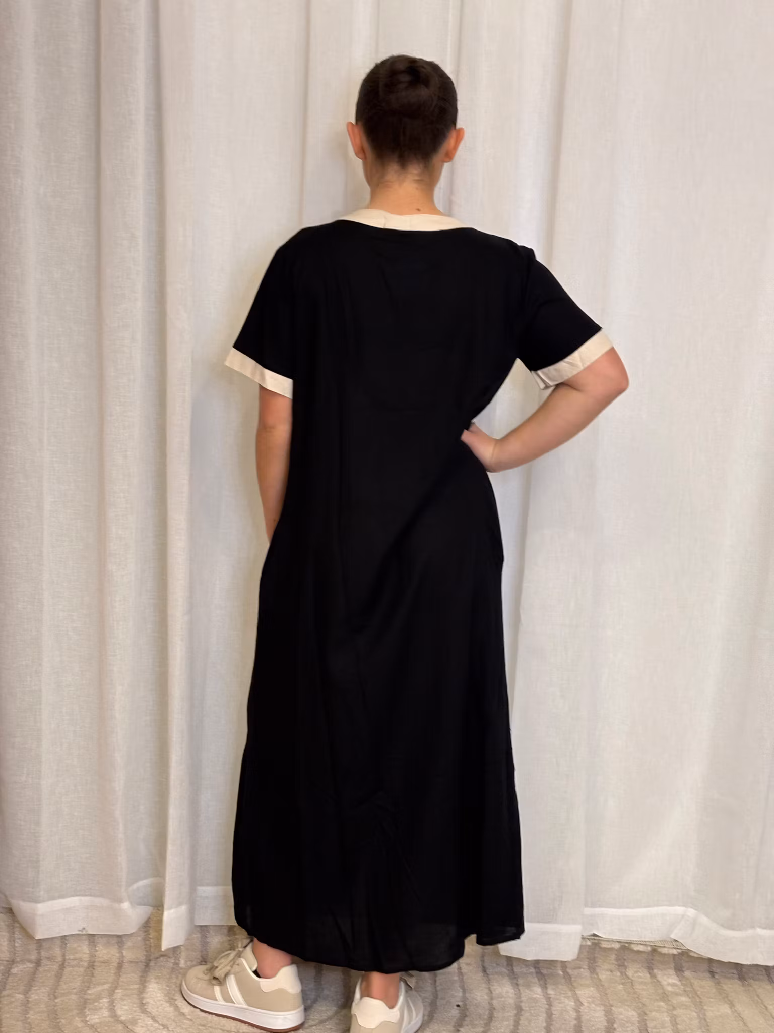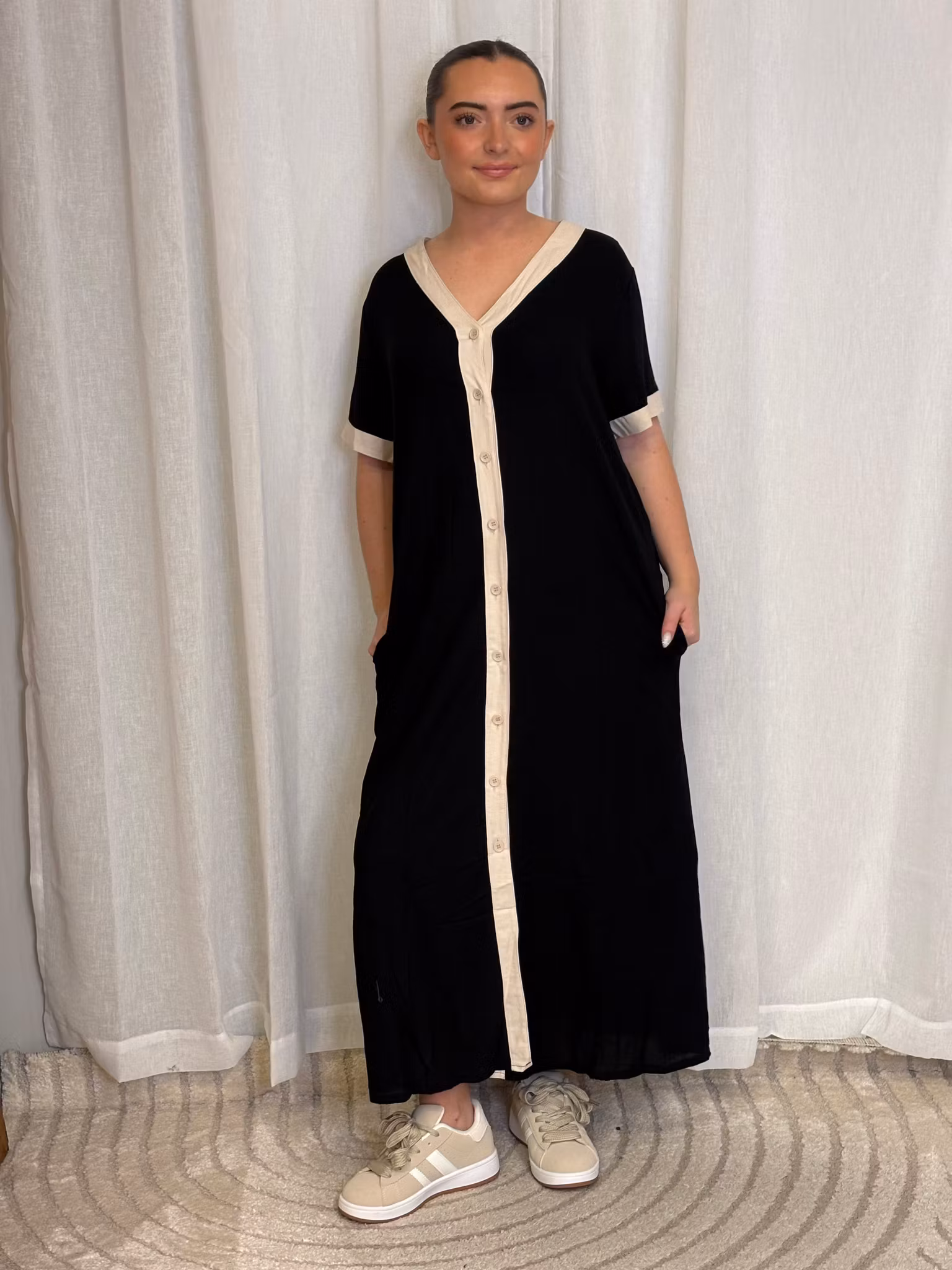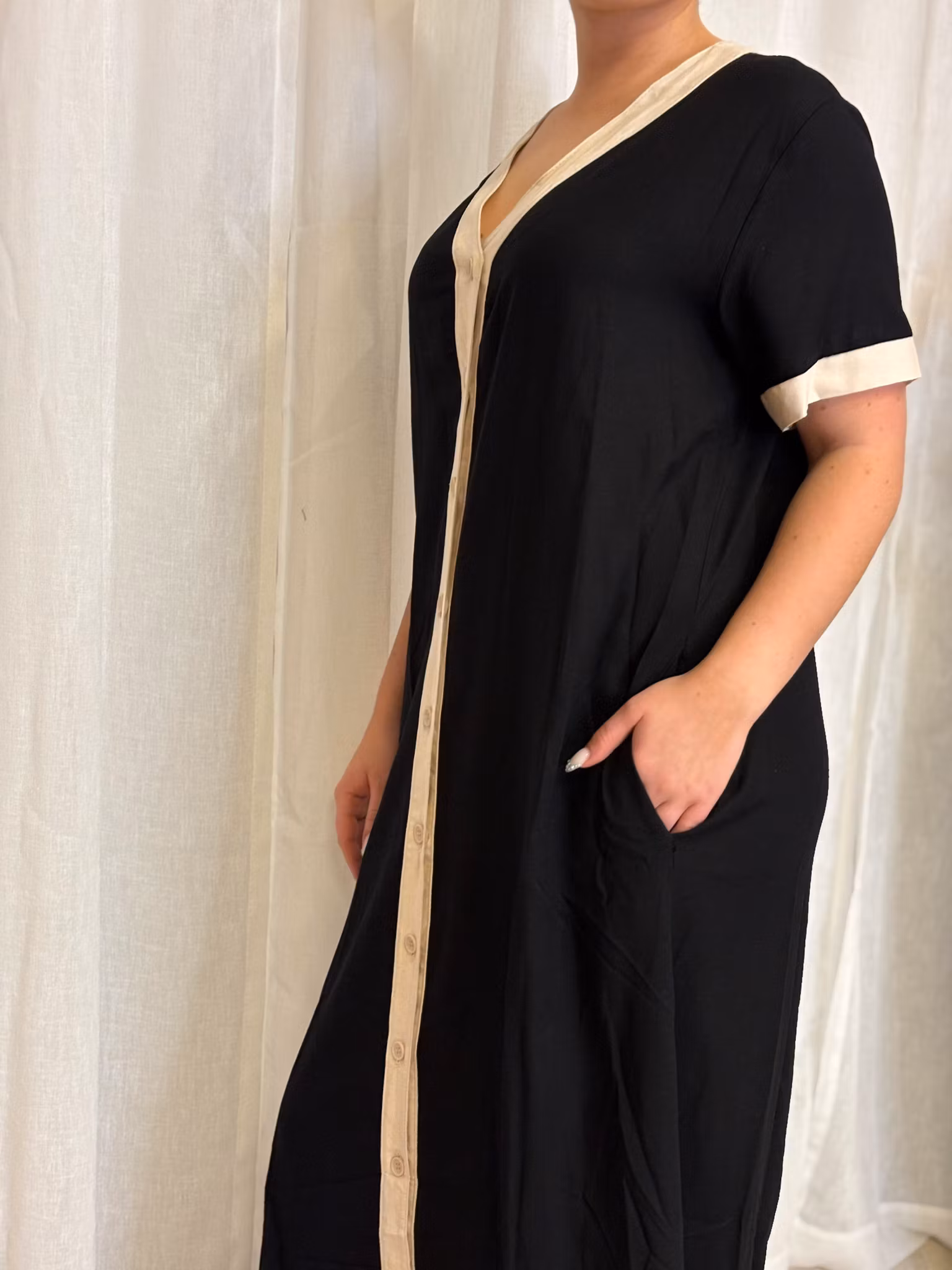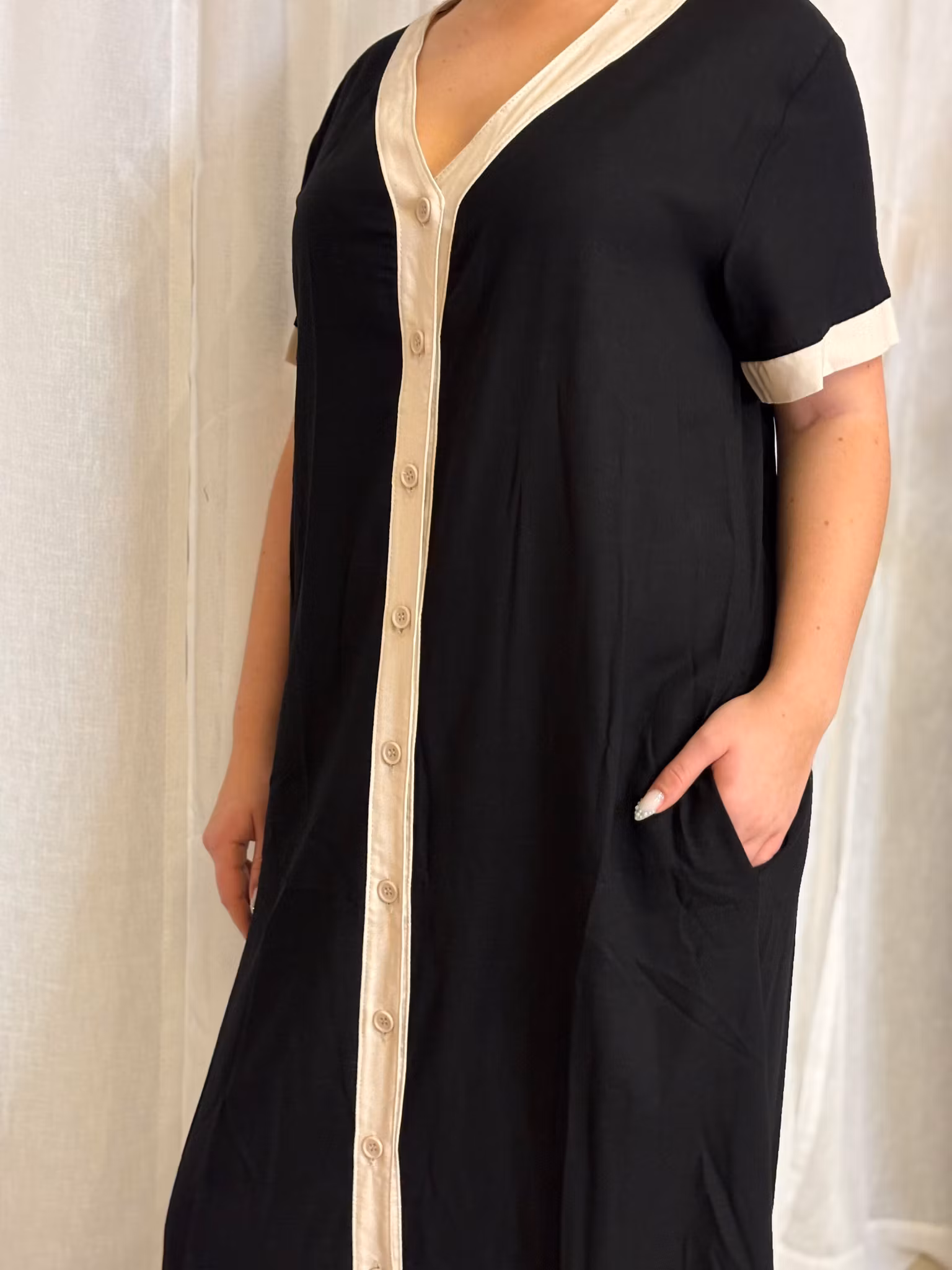 Fin helknäppt klänning i skön lin/viscose blandning och med fickor.