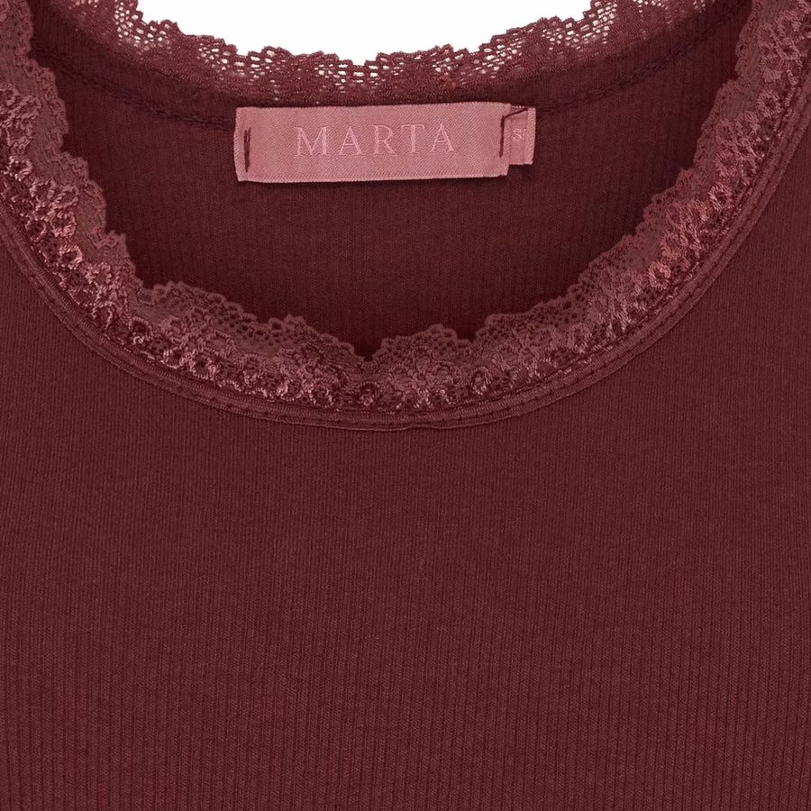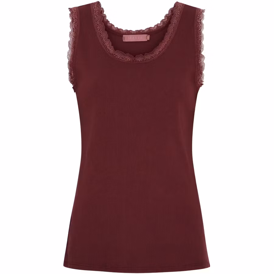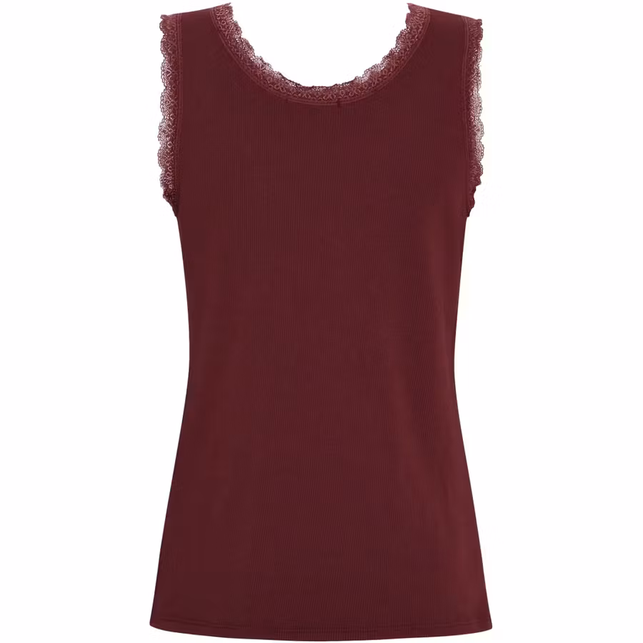 Feminin tanktop med fina spetsdetaljer längs halsringningen och ärmöppningarna. Fungerar som basplagg eller att styla ensam på varma dagar.
